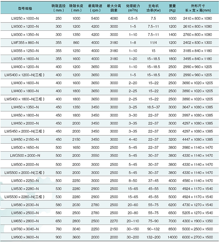 • 卸料沉降臥螺離心機的產品主要型號及技術參數